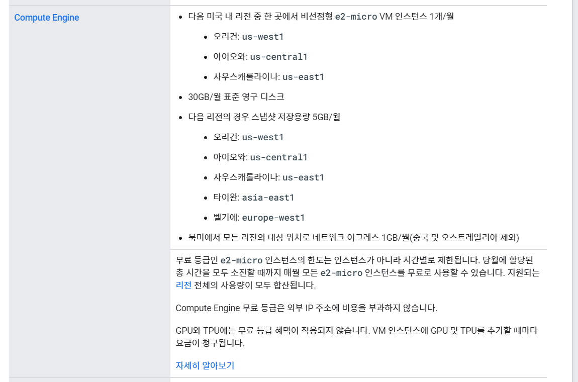 | 무료 사용 VM 종류 | e2-micro | E2.1.Micro | t2.micro | Micro-g1 |